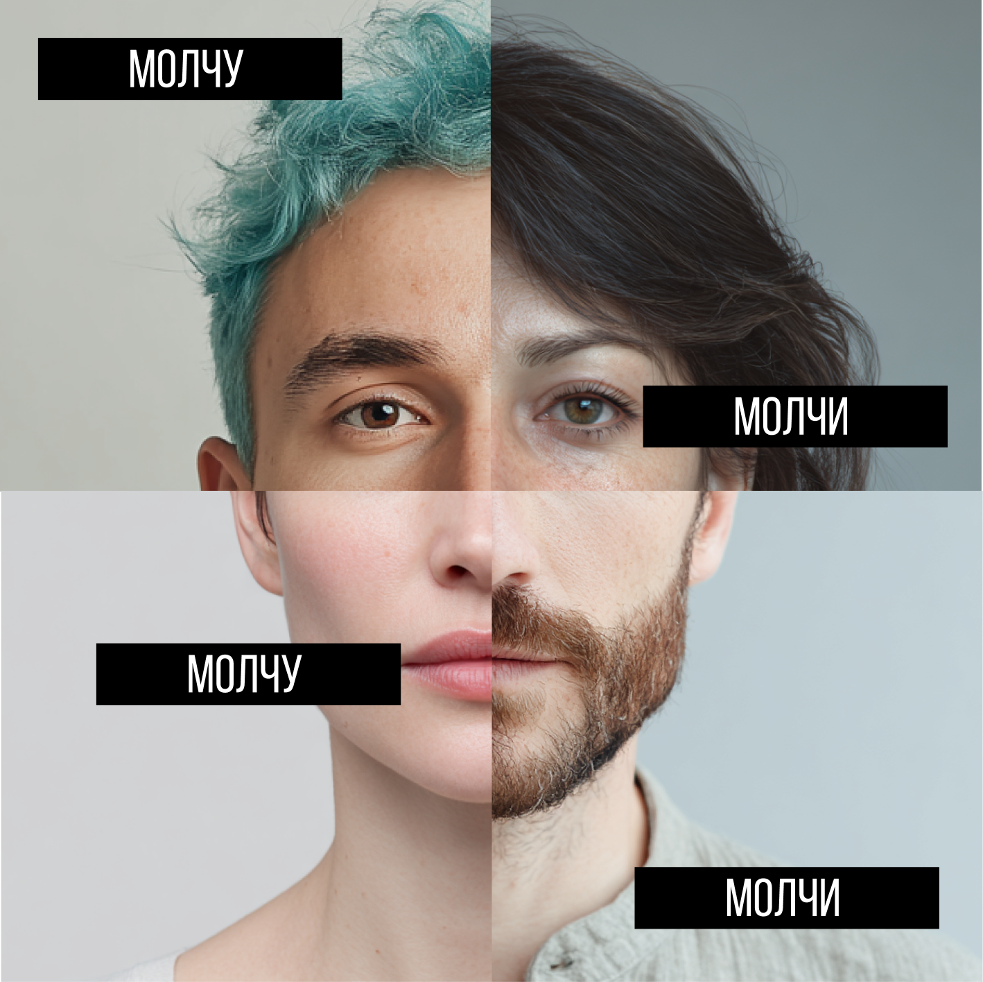 Я соединяю лица мужчин, женщин, детей и стариков в один образ, потому что у насилия нет типажа. За каждым лицом — живой человек. Ты не один. Таких, как ты, тысячи. И вместе мы можем разорвать молчание.Этот проект — попытка дать голос тем, кого заставили замолчать.